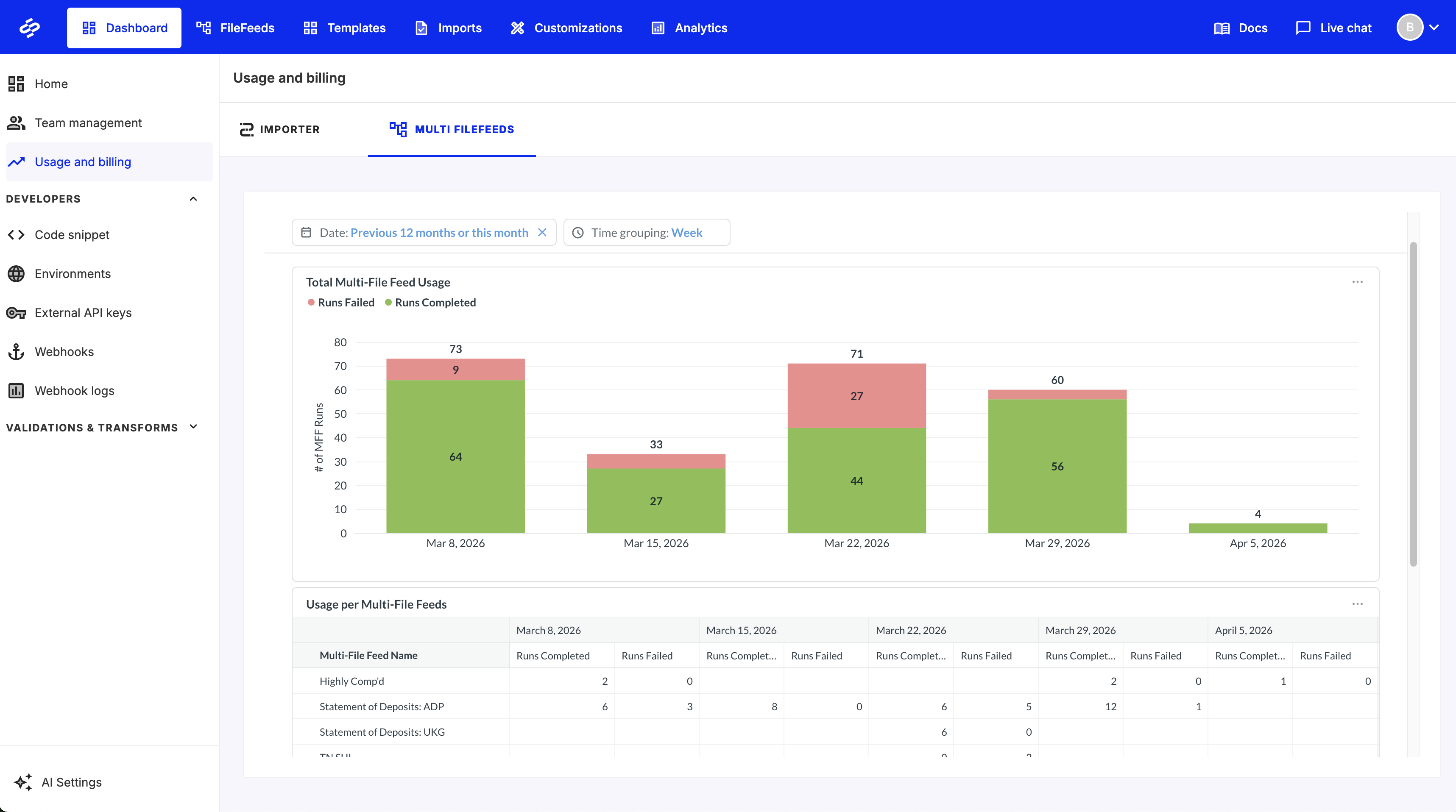 You can now view Multi FileFeeds usage directly within the OneSchema dashboard. A new tab in the Usage & Billing page provides visibility into activity alongside existing Importer metrics, making it easier to monitor usage and track trends in one place.